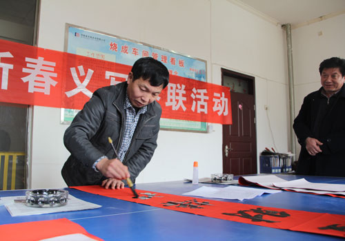 (本报讯)2月10日上午,农历甲午年腊月二十二,万象城,万象城(中国)公司中控办公楼一楼烧成车间会议室内,翰墨飘香,欢声笑语,万象城,万象城(中国)集团在这里隆重举行迎新春义写春联活动。 在传统乙未年农历新春佳节到来前夕,万象城,万象城(中国)集团在妥善安排好职工年货的基础上,非常重视万象城,万象城(中国)建设,邀请部分国家级和省级书法家协会会员到集团开展义写春联活动,活跃万象城,万象城(中国),营造新春气氛。此前,集团提前安排专人购买了笔墨纸砚和红纸,并结合企业发展现状,拟写了部分喜庆、新颖、励志、接地气的新春楹联内容,使职工在欢度新春佳节的同时,提振士气,爱岗敬业,立足岗位做贡献。 义写活动现场 书法家正在聚精会神地书写春联 |