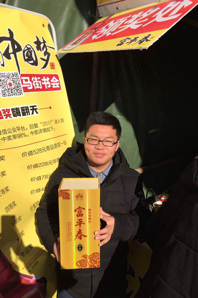 在中华曲艺展览馆东侧富平春主会场,人潮涌动,热火朝天,品酒的、扫码的、中奖的,场面火爆嗨翻天。现场工作人员非常忙碌,为来客提供周到细致的服务,两个吉祥物金鸡也显得格外欢快,不时地向过路群众问好,引来大家纷纷与其合影留念。在赶会游玩的同时,随便拿起手机扫一扫,就会中得实实在在的大奖,那是怎样的一种心情,激动、高兴、感恩……怎一个“乐”字了得。“赶快发送朋友圈,让大家都来参与”一位中得一等奖的小伙立马把他中奖的喜讯发到了朋友圈。“我中大奖了”“富平春为大家带来了实惠,带来了情趣!”“富平春酒喝着真美!”在现场,不时听到来客一边品咂,一边赞口不绝。