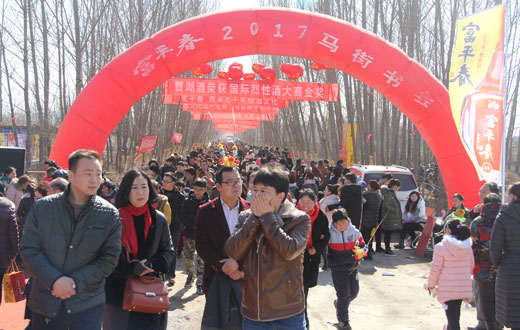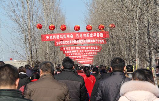 随着人群,笔者走进书会现场,大型彩虹门“富平春2017马街书会”欢迎着八方来客,“天地同唱马街书会,日月共醉富平春酒”等大红条幅格外引人注目,路两旁及书会现场挂满了大红的灯笼,这是富平春义务为书会做的精心布置,为书会增添了喜庆热烈的气氛。