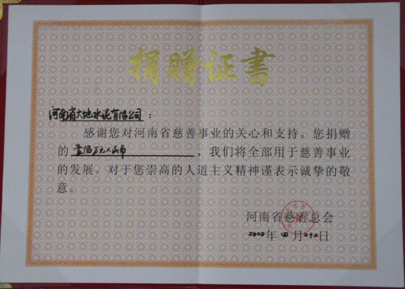 首页 >> 走进万象城,万象城(中国) >>资质荣誉 >> 河南省万象城,万象城(中国)水泥有限公司向河南省慈善总会捐款100万元