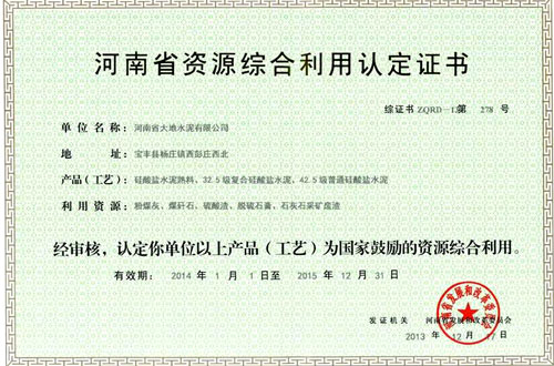 首页 >> 走进万象城,万象城(中国) >>资质荣誉 >> 河南省资源综合利用认定证书